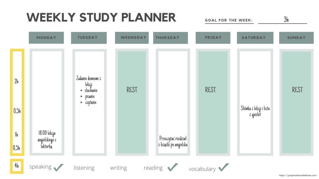Na początku każdego tygodnia sprawdzam co mnie czeka i planuje ile godzin mogę poświęcić na naukę. W kalendarz wpisuje zadania i czas, jaki chcę na nie poświęcić. Po tygodniu widzę, co udało mi się osiągnąć i czy zmierzam w dobrym kierunku. Możesz do tego użyć zwykłą kartkę, Google kalendarz, albo planer, który dla Ciebie przygotowałam.