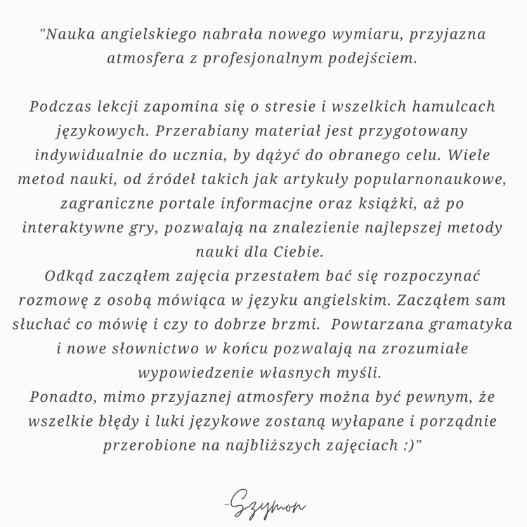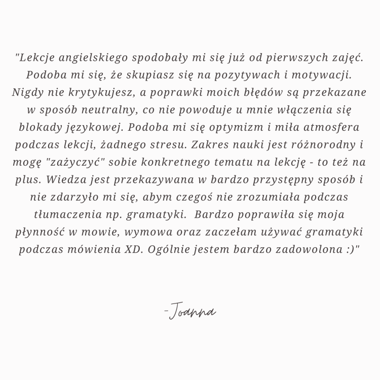 Umów się na pierwszą lekcję próbną, na której omówimy Twoje potrzeby, doświadczenie z językiem angielskim oraz ustalimy cel i plan działania. Pierwsza lekcja pozwoli Ci przetestować mój sposób nauczania i zdecydować czy jest to metoda, która Tobie odpowiada.